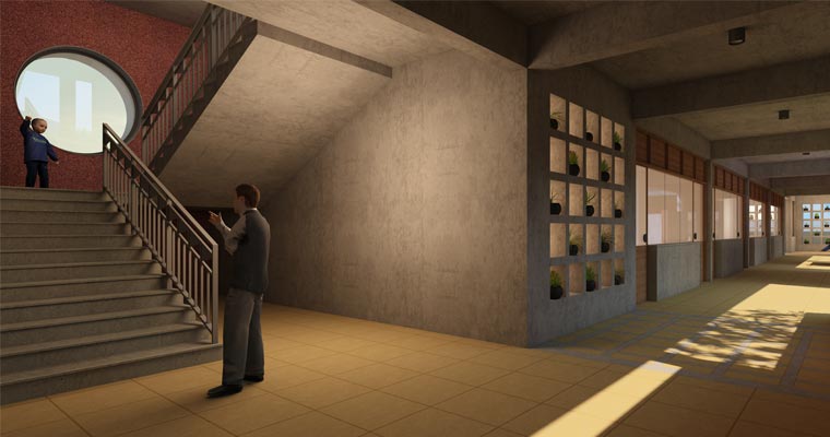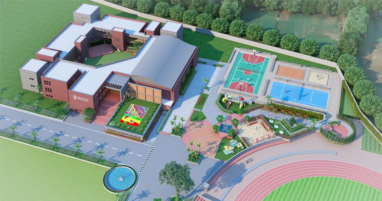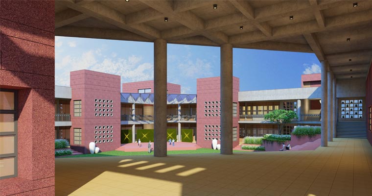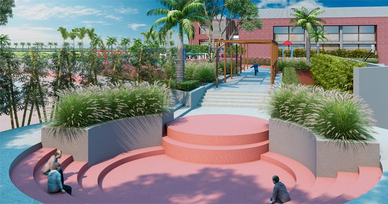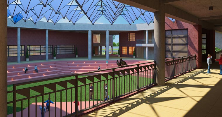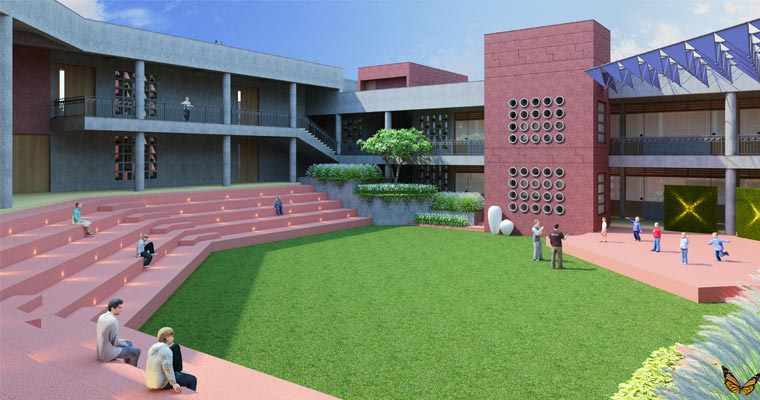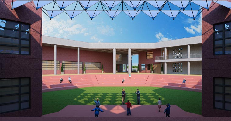 Ergonomically designed Landscape area which acts as a Learning-Scape for the students. Distinguished areas marked for Outdoor Learning and Reflection for approximately 300+ students in solitude, in small groups. Or Large Groups. A functional amphitheater for the students to study in their mandatory Daily Outdoor Class amidst nature. The child can spend their time in Reflection sitting amongst the trees or nearby the Fountain pondering over the endless possibilities that lie in front of them.
